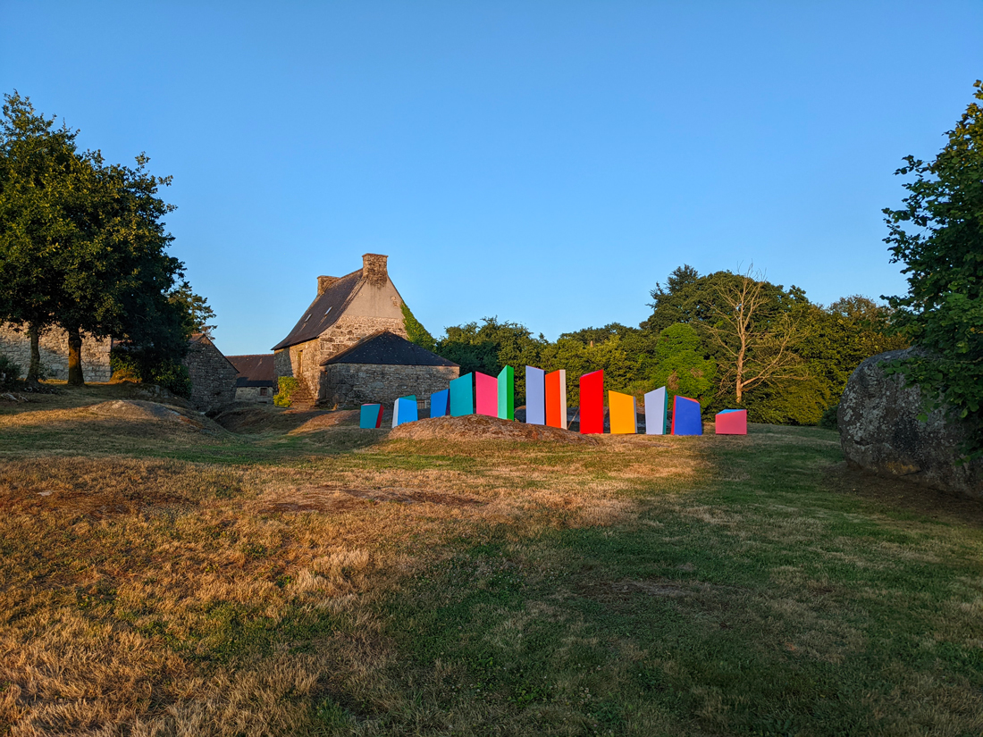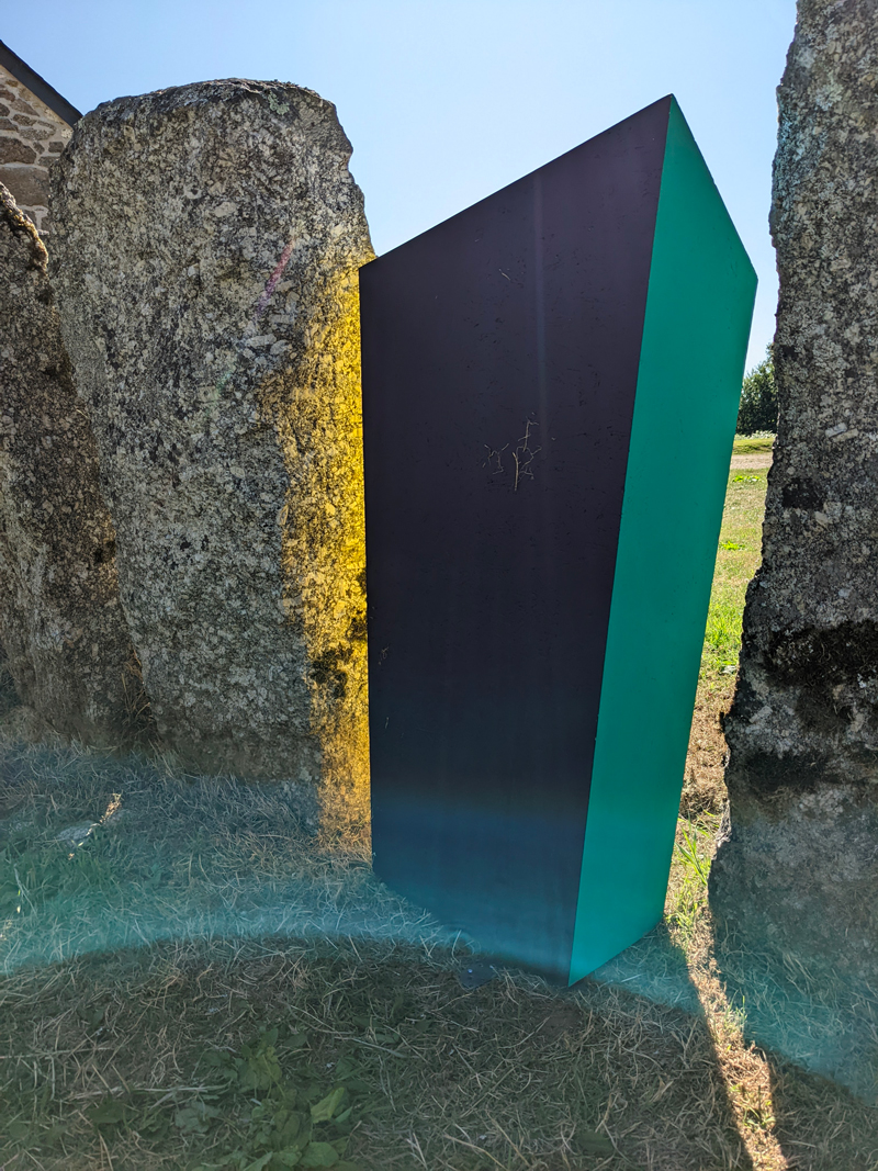 En Bretagne, on connaît bien les pierres levées, le gris du granit qui contraste sur les sols verdoyants et les nuances de bleu, de blanc et de gris du ciel. On y réactive sans cesse un lien fondamental à la nature, aux forêts, aux sources, qui abreuvent les imaginaires légendaires et les paysages intérieurs. Le paysage intérieur d'Élodie Boutry est baigné de couleurs et de géométrie. Ici, elle lui donne une nouvelle forme en l'inscrivant dans l'écrin patrimonial du hameau de Saint-Antoine.