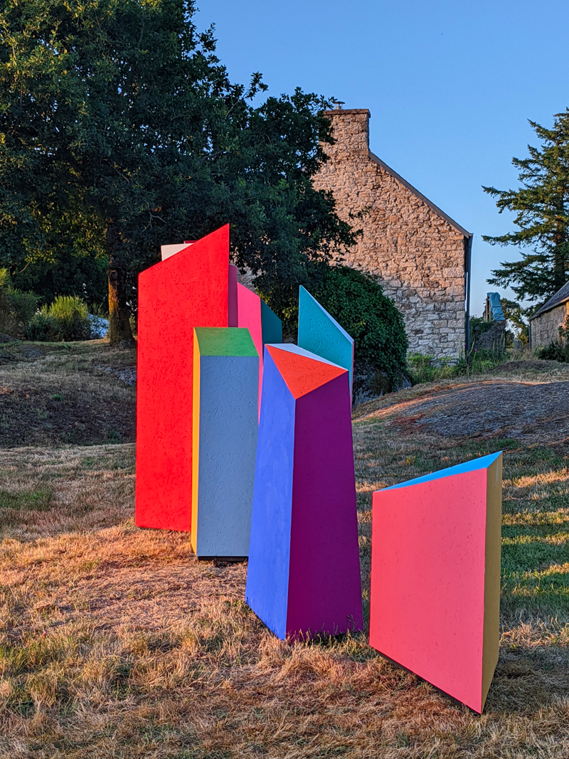 En Bretagne, on connaît bien les pierres levées, le gris du granit qui contraste sur les sols verdoyants et les nuances de bleu, de blanc et de gris du ciel. On y réactive sans cesse un lien fondamental à la nature, aux forêts, aux sources, qui abreuvent les imaginaires légendaires et les paysages intérieurs. Le paysage intérieur d'Élodie Boutry est baigné de couleurs et de géométrie. Ici, elle lui donne une nouvelle forme en l'inscrivant dans l'écrin patrimonial du hameau de Saint-Antoine.
